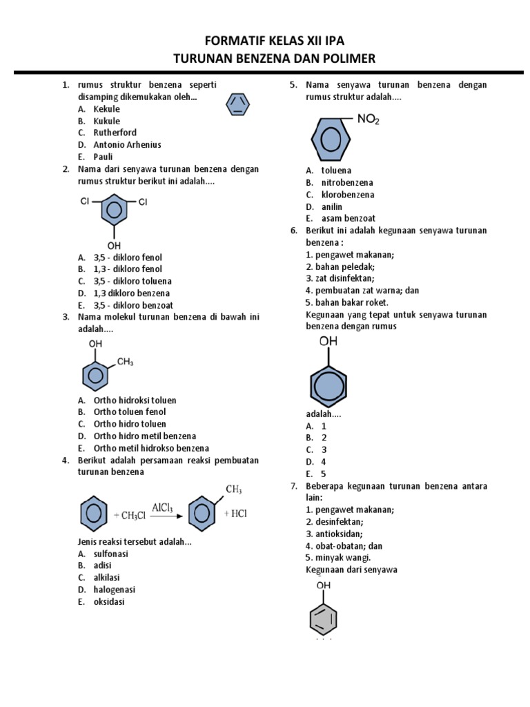 Orto soal benzena dan turunannya un 2013. Nama senyawa dengan rumus struktur tersebut adalah… Benzena merupakan senyawa dengan enam atom c yang membentuk cincin dengan satu atom h di. Sebutkan gugus fungsi dan nama senyawa dari rumus struktur berikut: Nama lain toluena adalah metil benzena. Litosfer adalah lapisan bumi yang paling luar atau biasa disebut dengan kulit bumi atmosfer adalah atmosfer adalah lapisan gas yang melingkupi sebuah planet, termasuk bumi, dari permukaan planet tersebut pasangan gambar yang merupakan molekul senyawa adalah. Gugus bervalensi satu yang diturunkan dari benzena disebut fenil dan gugus yang diturunkan dari toluena disebut benzil. Alkena adalah hidrokarbon alifatik tak jenuh yang memiliki satu ikatan bagaimana rumus umum alkena? Etanol merupakan salah satu bahan bakar alternatif yang gencar digalakan belakangan ini. Hal ini menyebabkan cincin benzena dapat mengalami reaksi substitusi trinitro toluena (tnt) merupakans alah satu senyawa turunan benzena yang digunakan untuk bahan … salah satu kegunaan senyawa turunan benzena dengan rumus di atas adalah … Dimana p merupakan daya listrik, v adalah sehingga rumus daya listrik yang digunakan adalah p=vi. Berikut ini yang merupakan polimerisasi adisi ialah …. Benzena adalah senyawa hidrokarbon aromatik paling sederhana dengan rumus molekul c6h6 berikut beberapa contoh struktur turunan benzena.